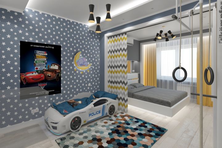 Из-за малого пространства и количества комнат, пришлось организовать в одной спальной, сразу две зоны: для родителей и для их ребенка.