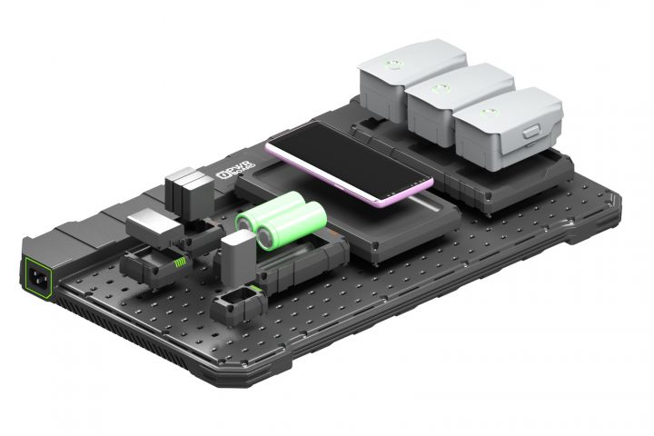 Удобная универсальная зарядка для самых разных устройств. Грубо говоря, это не просто зарядка с кучей торчащих проводков с разными разъемами. Это платформа, с сеткой контактных отверстий 20х20 мм, на которую в любом месте и в любой ориентации можно устанавливать модули для зарядки каких угодно аккумуляторов.