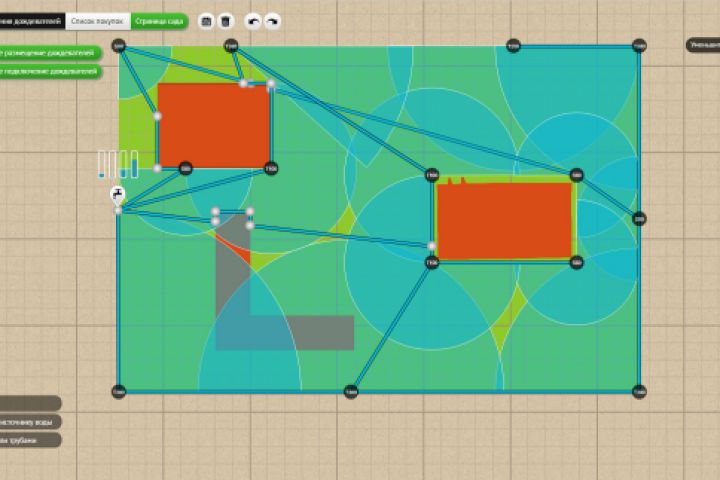 Конструктор сада на js canvas. Автоматическое размещение дождевателей, труб и других элементов. Поддерживается сохранение и история действий. В конце пользователь получает просчет системы полива