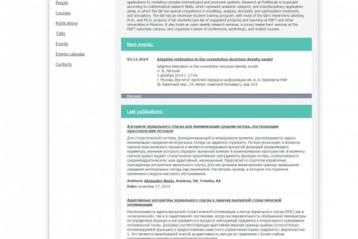 Мультиязычный сайт лаборатории МФТИ PreMoLab. Личные страницы пользователей, публикации, события, учебные курсы, направления исследований и проекты. Все события автоматически встраиваются в единый календарь событий.