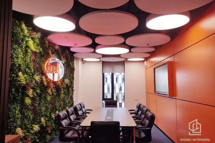 В составе офисного проекта наша студия разработала отдельную переговорную комнату, которая должна была выполнять сразу несколько задач: