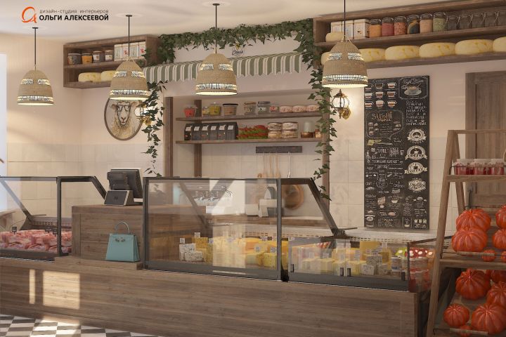 • Полный цикл услуг от разработки концепции и планировки до полной комплектации и авторского надзора над созданием интерьера магазина по продаже фермерских сыров: