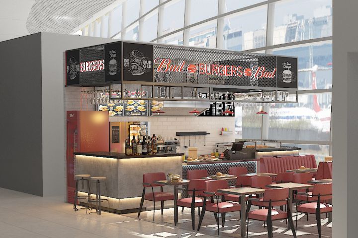 «Bad Burgers» - один из наших проектов в аэропорту. На этапе получения технического задания, Заказчик знал метраж и пожелания к формату, далее я разработала планировку, исходя из требований к проектированию, создала концепцию будущего кафе и подключила к работе технолога пищевого производства. В таком тандеме мы работаем уже не первый год. У Заказчика на руках дизайн-проект, который можно легко воплотить со всеми материалами, с грамотным расположением оборудования, списком оборудования, с точками подключения, мощностью, монтажными привязками.