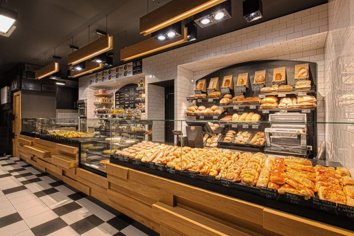 Порадовать домашних можно свежей выпечкой, перекусить за уютными столиками. Мы предложили интересный дизайн, обратите внимание на витрину, она обшита деревом с геометрическими вставками, выглядит стильно, а в сочетании с кирпичной кладкой стен, получился уютный домашний интерьер.