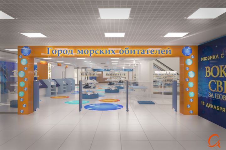 В 2018 году нашей студией разработан дизайн входной группы и магазин по продаже сувениров и игрушек, расположенный на первом этаже, общей площадью 316,0м2. В магазине продаются игрушки на морскую тему.