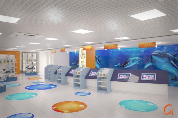 В 2018 году нашей студией разработан дизайн входной группы и магазин по продаже сувениров и игрушек, расположенный на первом этаже, общей площадью 316,0м2. В магазине продаются игрушки на морскую тему.