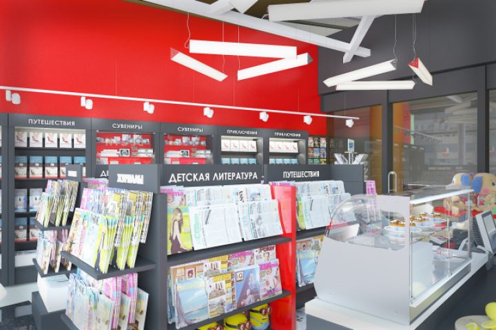 После согласования общего дизайна и визуализаций магазина, мы разработали полный дизайн-проект, с расстановкой оборудования, освещением, развертками, рабочими чертежами для строителей, выполнили визуализацию всех типов стеллажей, кассового стола, барной зоны, на каждый элемент была разработана рабочая документация. К тому же все оборудование мы разработали для магазинов «Вести» новое, исходя из ассортимента, удобные стеллажи с наклонными полками, острова, где выгодно располагается сувенирная продукция.