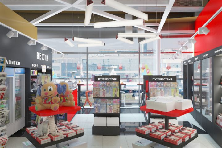 Так как новые магазины, планировалось расположить в новом Терминале B, мы интегрировали дизайн магазинов, в концепцию дизайна интерьера Терминала, который берет свое начало в великих идеях русского конструктивизма. Они созданы на основе простых и четких геометрических форм, насыщенных яркими позитивными цветами.