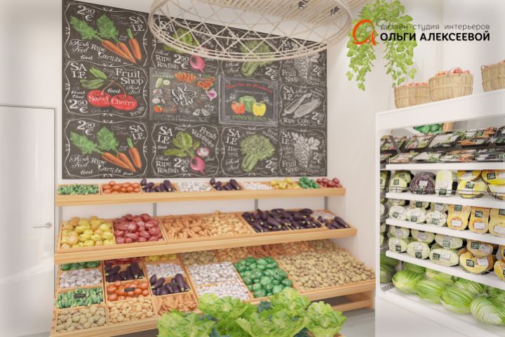 Сложность: Большой ассортимент овощей и фруктов нужно было разместить на небольшой площади торгового зала, всего 37м2