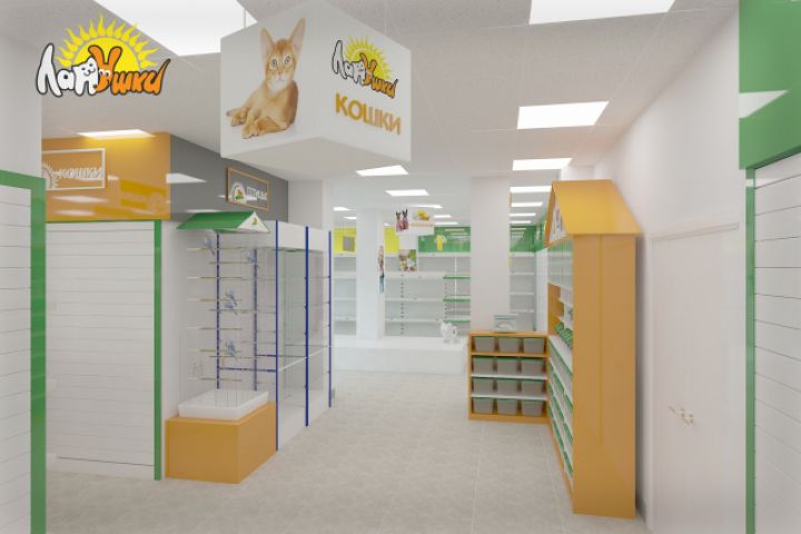 Дизайн-проект магазина разрабатывался удаленно, так как магазин находится в г. Нижний Новгород . Проект выполнен в короткие сроки, учтены все пожелания Заказчика. Мы разработали схему расположения оборудования, чертежи для изготовления стеллажей, кассового стола. Навигация, цветовое оформление зоомагазина так же разрабатывалась нашей студией.