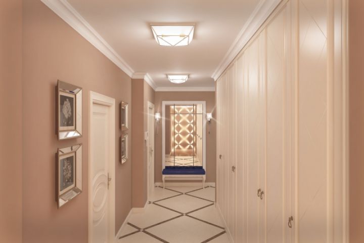 Дизайн-проект квартиры площадью 160м2, расположенной в подмосковном городе, разрабатывался для семейной пары с двумя детьми. Особенность квартиры наличие окон, из которых открывается великолепный вид на реку Волга. Стена в объединённой кухне-гостиной придает интерьеру плавность. Для оформления квартиры была выбрана современная классика. Удобное планировочное решение предусматривает наличие вместительного кухонного гарнитура, столовую, место для отдыха всей семьи. В Дизайне детской комнаты обращает на себя панно расположенное за изголовьем кровати. Спальню объединили с лоджией, и получилось функциональное пространство, включающее в себя кабинет, спальню и гардеробную. Комната для девочки получилась светлая, воздушная. В прихожей точечные настенные светильники расположили так, что обращают при входе в квартиру на себя внимание, к тому же красиво отражаются в зеркале, расположенном напротив стены со светильниками. Богатство оттенков создают запоминающееся декоративное решение.