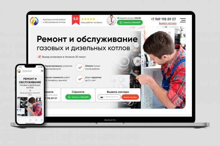 Клиент — сервис по ремонту и обслуживанию газовых и дизельных котлов — поставил задачу получить «под ключ» коммерческий сайт, который сразу начнёт принимать заявки и при этом подчеркнёт оперативность, доверие и экспертность компании. В приоритете — главный блок с сильным УТП (быстрый выезд, гарантия, оплата после работы) и несколько блоков-захватов, чтобы максимально упростить путь пользователя от «проблема» до «вызова мастера». Также нужно было интегрировать мессенджеры и социальные контакты для моментального общения и подключить формы с автоматической передачей лидов. Сайт должен работать 24/7 и давать клиенту инструмент для запуска рекламы и SEO.