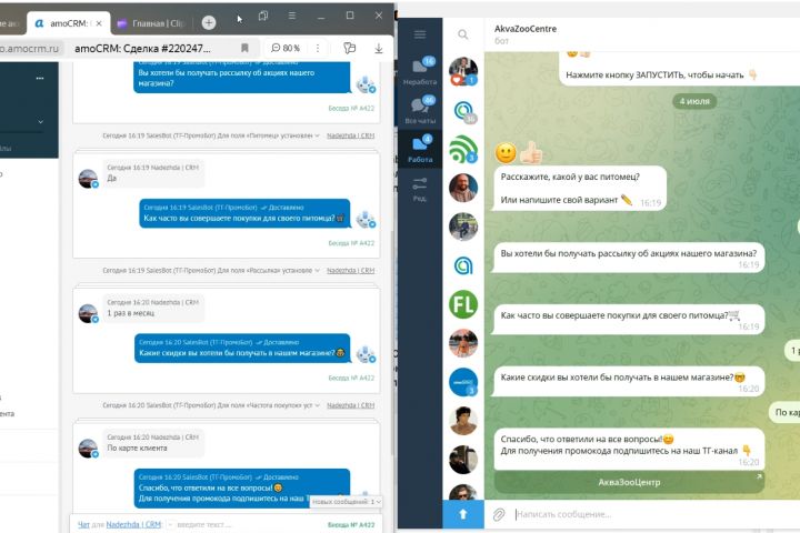 Чат-бот, совмещенный с интерфейсом amoCRM, для удобного хранения и дальнейшей обработки клиентской базы.