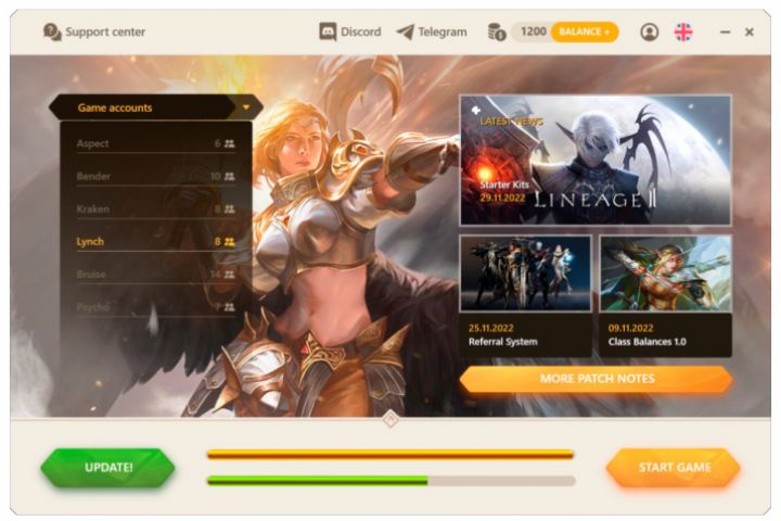 Лаунчер для частного сервера игры Lineage 2. Функционал: - логин мастер аккаунтом - вывод списка игровых аккаунтов - вывод баланса аккаунта - вывод последних трех новостей (патчноутов) - обновление игровых файлов - запуск игры