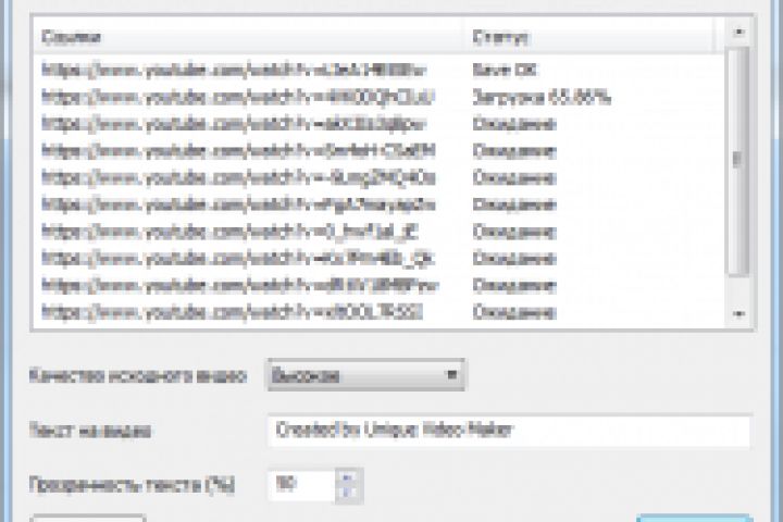 Программа предназначена для уникализации видео с YouTube. Другими словами, для того чтобы взять какое-то популярное видео и выдать его за свое (если просто добавить чье-то видео тогда YouTube определит дублирование). В программу нужно добавить ссылки на YouTube, выбрать качество, текст и его прозрачность и нажать «Начать». После чего программа начнет по очереди обрабатывать ссылки. Сначала загрузит видео, а затем наложит на видео прозрачный текст. После чего YouTube будет определять конвертированные видео как уникальные. Видео сохраняется в формате Windows Media Video 9, разрешение остается оригинальным, битрейт ~5 Mbps.