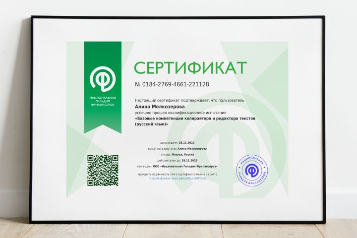Сертификат «Базовые компетенции копирайтера и редактора текстов»