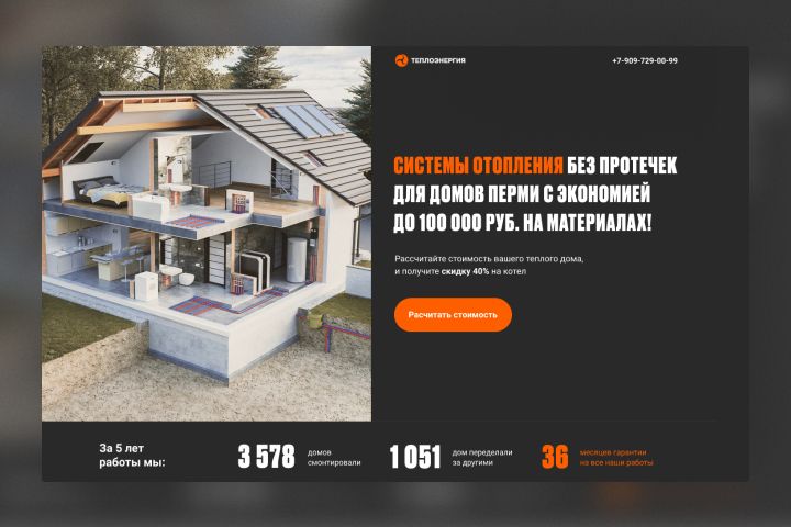 Представляю вашему вниманию лендинг для компании "Теплоэнергия", компания занимается продажей и монтажем отопительных систем. Моей задачей было разработать продающий лендинг на замену старого и сверстать его на Тильде. В начале я проанализировал старый сайт, взял нужные тексты и преимущества и начал работать над структурой будущего лендинга. Отсмотрел сайты конкурентов я собрал список обязательных блоков, составил из них прототип и после утверждения начал работу над дизайном. Дизайн был быстро утвержден, а затем сверстать на Тильде. Сайт адаптивен и быстро загружается.