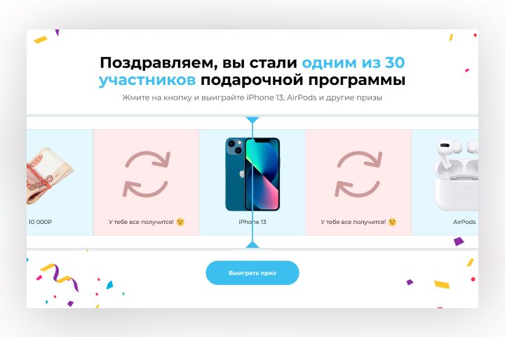 Друзья, представляю вашему курс по похудению с возможностью не только похудеть и стать лучше, но еще и выиграть ценные призы, такие как iPhone 13, AirPods и многие другие. В рамках этого проекта я разработал Landing page, на который будет запускаться трафик — стартовую страницу, а также страницы с мини-играми, в которых можно будет выиграть призы, о которых я писал выше. Всего игры 3: Колеса Фортуны, Рулетка и Боксы. Механизм взаимодействия следующий: человек попадает на landing page, далее переходит на одну из игры (их 3 для теста, трафик будет делиться между ними), нажимает кнопку и начинает игру (у него есть 3 попытки), первая неудачная, вторая тоже, а вот на третьей он выигрывает и выигрывает возможность забрать iPhone и други призы. Что реально получить приз, нужно сбросить большего всего веса на марафоне.