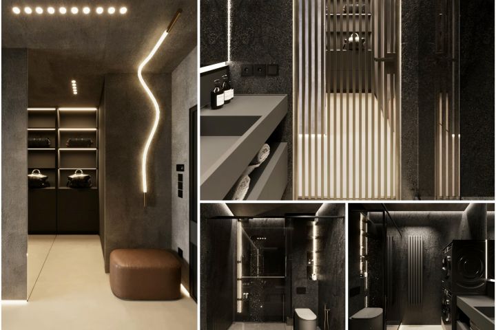Апартаменты для холостяка ,временно под сдачу в аренду ,были применены антивандальные материалы для стен , широковорматный керамогранит в тёмных тонах для стен и широкоформатная плитка для пола.