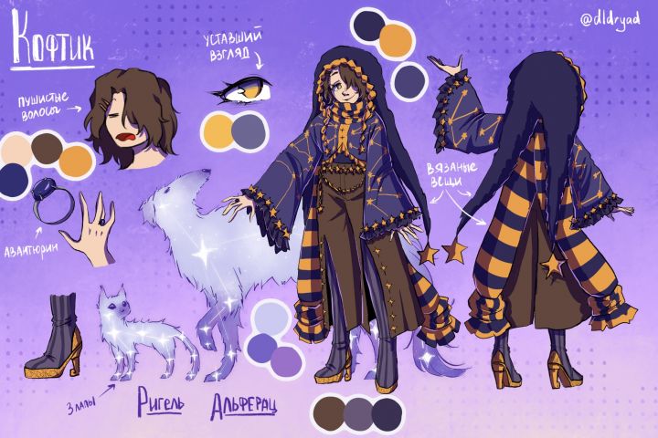 Концепт персонажа, вид спереди, вид сзади, цвета и детали