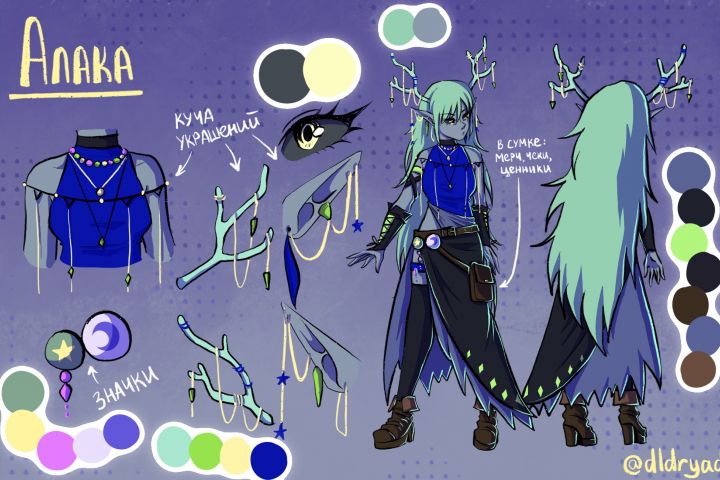Концепт персонажа, вид спереди, вид сзади, цвета и детали