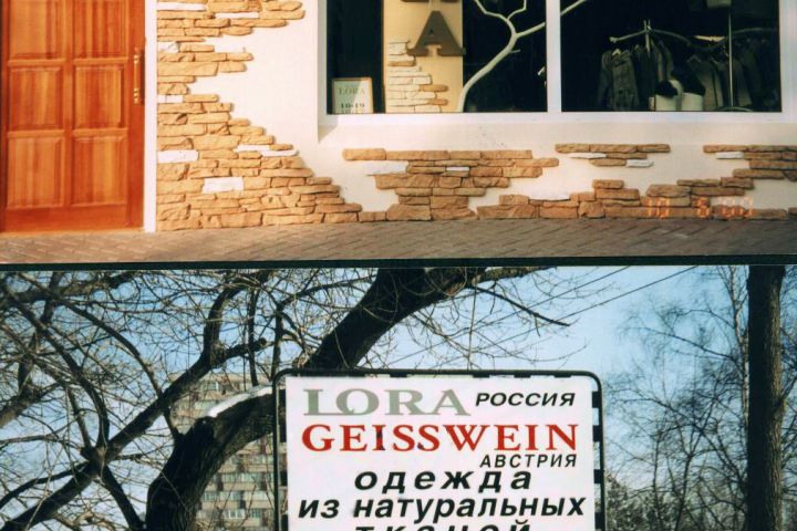 Изготовление конструкции и рекламного щита, Установка конструкции с рекламой. Оформление витрины, фасада (имитация природного камня) и внутреннего интерьера магазина Lora