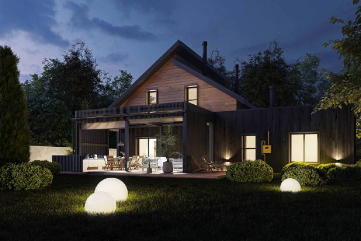 Вечерний вид загородного дома. Общая площадь 150м2.