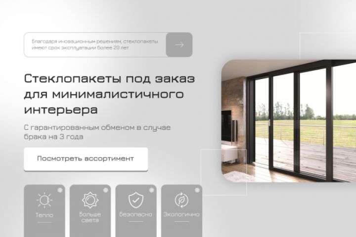 Минималистичный стиль. Строгие цвета дополняют концепцию бренда по продаже стеклопакетов. Программы используемые для дизайна: Adobe Photoshop; Figma.
