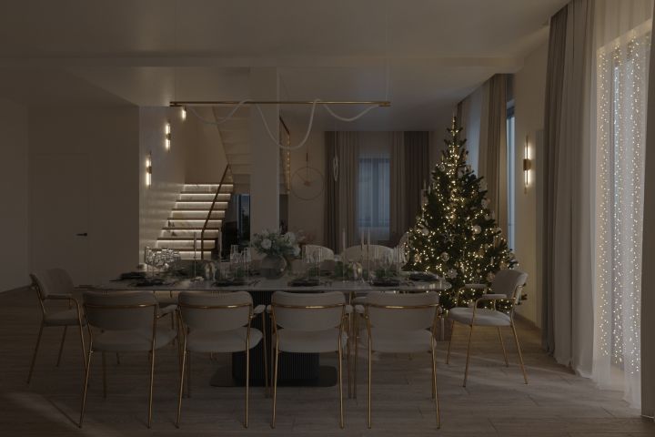 Особенности проекта - большая кухня-гостиная. Были мысли немного отделить зону гостиной небольшой перегородкой у колонны или приставной мебелью, но решили оставить колонну посередине комнаты, как она есть, очень уж хотелось воздуха хозяевам :)