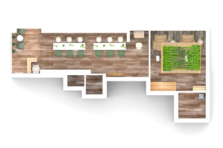Размеры помещения даны заказчиком. По ним была составлена 2д-схема с расстановкой мебели, учитывая пожелания заказчика. После согласования, отрисован 3д-план помещения в программе Компас 3д, расставлена мебель и наложены текстуры в программе KeyShot. В программе 3ds Max выполнены чертежи недостающих шкафов.