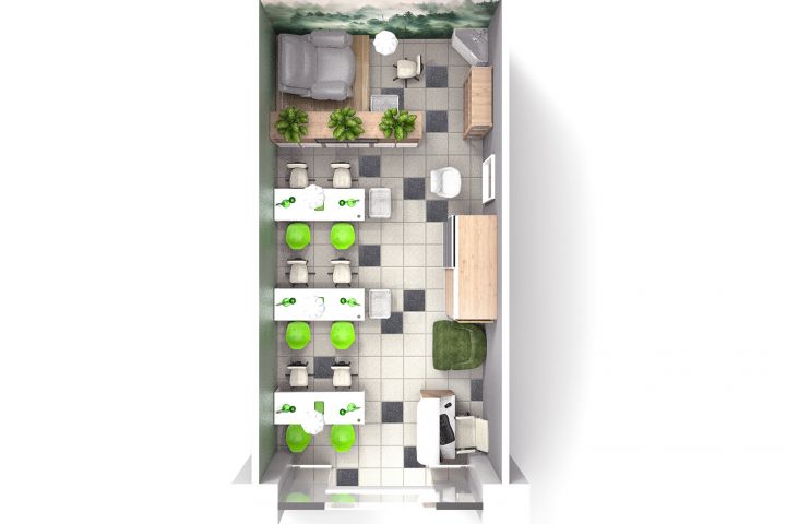 Размеры помещения даны заказчиком. По ним была составлена 2д-схема с расстановкой мебели, учитывая пожелания заказчика. После согласования, отрисован 3д-план помещения в программе Компас 3д, расставлена мебель и наложены текстуры в программе KeyShot. В программе 3ds Max выполнены чертежи недостающих шкафов.