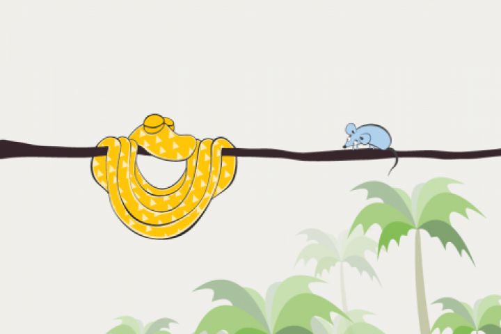 Иллюстрация для языковой школы к Новому году -- году змеи. Идея: змея и мышка вполне ладят друг с другом и сидят на одной ветке.