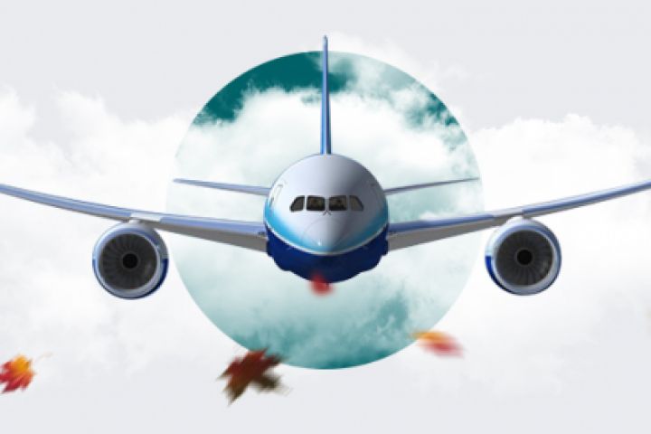 Коллаж для шапки Домодево на Facebook из фотографии самолёта, листьев, облака и векторной плашки.