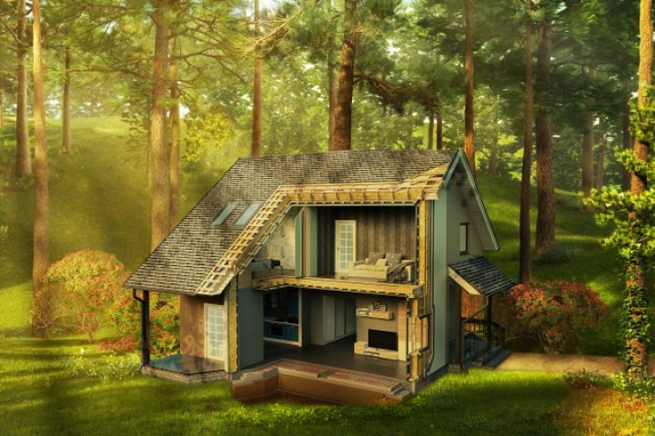 Задача: встроить дом в лес, как будто он там и был. Сложность в реализации была в том, что выбранный фон леса уже был с изображением другого дома. Пришлось удалять уже имеющийся дом на снимке, а только после вставлять нужный. Потом много часов работы с тенями, светом, бликами, чтобы картинка выглядела однородной.