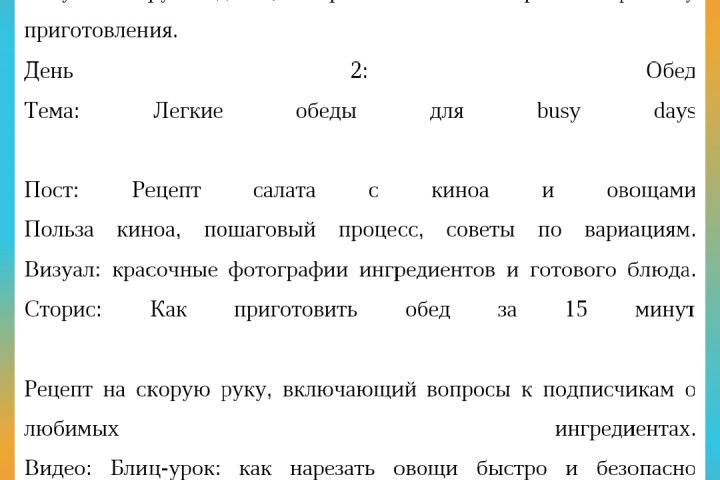 Этот план поможет разнообразить контент, привлечь внимание подписчиков и поддерживать их интерес к кулинарным темам!