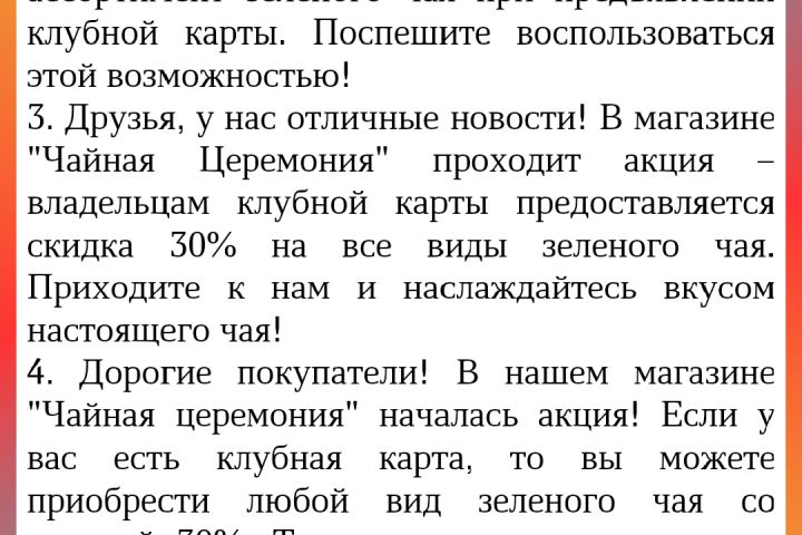 3. Друзья, у нас отличные новости! В магазине "Чайная Церемония" проходит акция – владельцам клубной карты предоставляется скидка 30% на все виды зеленого чая. Приходите к нам и наслаждайтесь вкусом настоящего чая!