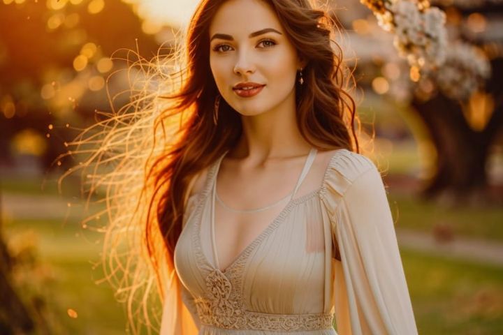 Изображение мягкое, теплое и романтичное. Оно изображает женщину как красивую и неземную. Освещение и композиция создают спокойную и мечтательную атмосферу.