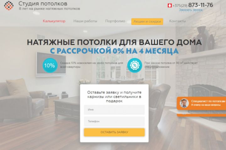 Разработали лендинг по тематике "натяжные потолки" в Минске и области.