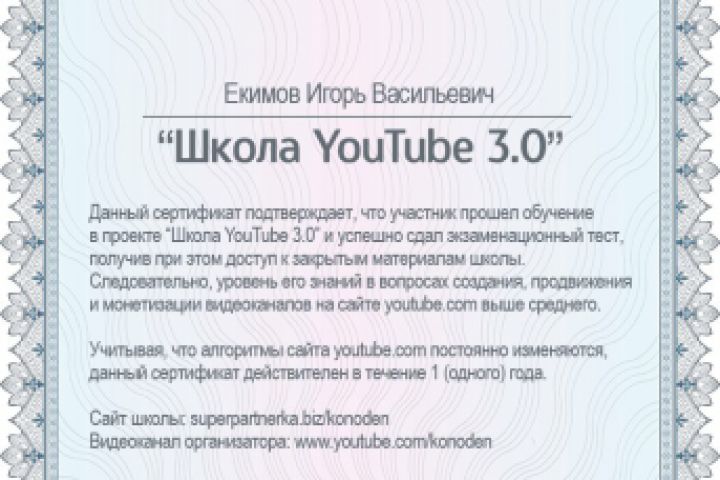 Прошел школу продвижению на Ютуб. Все экзамены сдал на отлично.