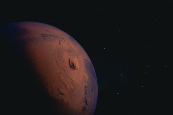 На холсте изображён оранжевый Марс, чей цвет похож на коррозию на металле.