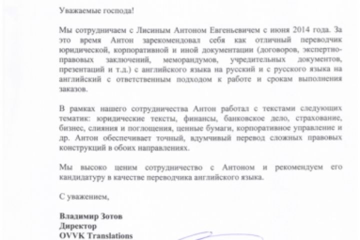 Рекомендательное письмо от бюро переводов OVVK Translations, с которым мы сотрудничаем с 2014 года по переводу текстов, связанных с корпоративной и юридической тематикой (контракты, меморандумы, роуд-шоу, презентации для инвесторов, корпоративные отчеты, IPO). Сопровождаем крупные международные сделки, работая с такими известными юридическими фирмами как Linklaters, Clifford Chance, Herbert Smith Freehills и другие.