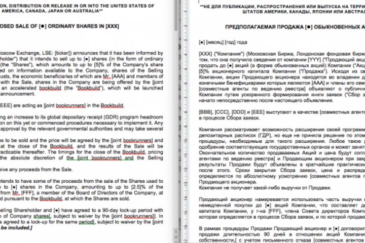 Перевод анонса предстоящей продажи акций. Документ в обезличенной форме.