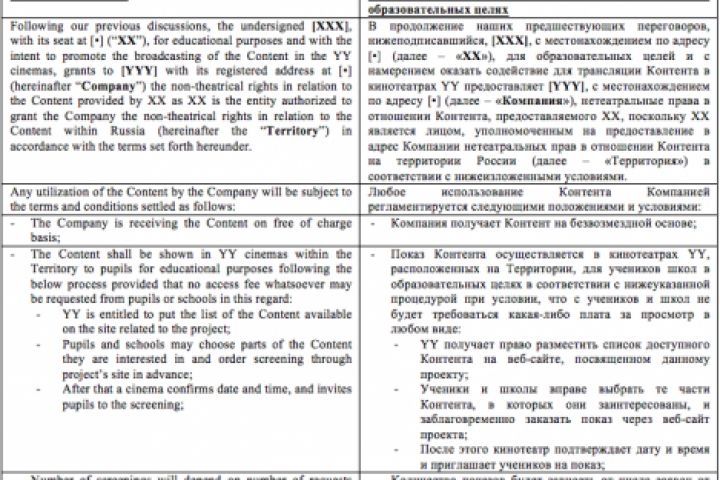 Разрешение правообладателя на показ определенных фильмов в сети кинотеатров. Документ в обезличенной форме, оформлен в двуязычном формате (в виде таблицы с английским и русским текстом).