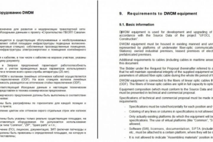 Несколько глав технических требований + приложения (из договоров поставки оборудования компании Ростелеком). Переведено с русского на английский.