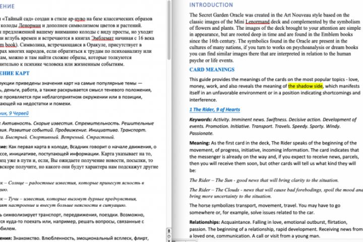 Перевод с русского на английский отрывка описания к колоде Ленорман "Тайный сад". Эзотерика, художественный перевод.