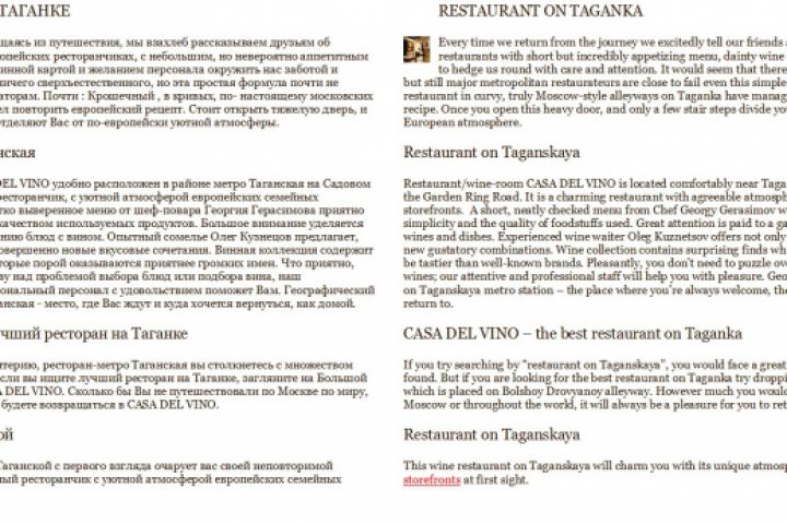 Ru-En перевод рекламных текстов для ресторана Casa Del Vino.