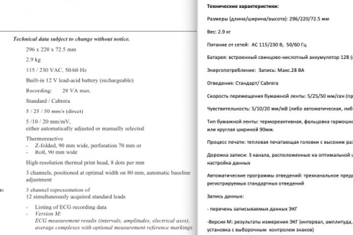 Перевод с английского на русский технических характеристик прибора ECG Seca CT3000i (для записи ЭКГ).
