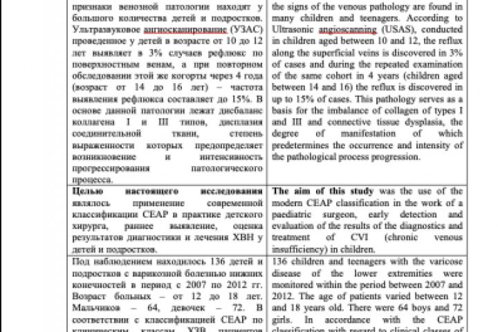 Перевод на английский клинического исследования "Современная диагностическая и лечебная тактика у детей с варикозной болезнью нижних конечностей".