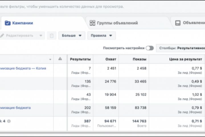 387 заявок со средней стоимостью 0.71$ получено путем настройки и показа рекламных объявлений в ленте и историях Инстаграм и Фейсбук.