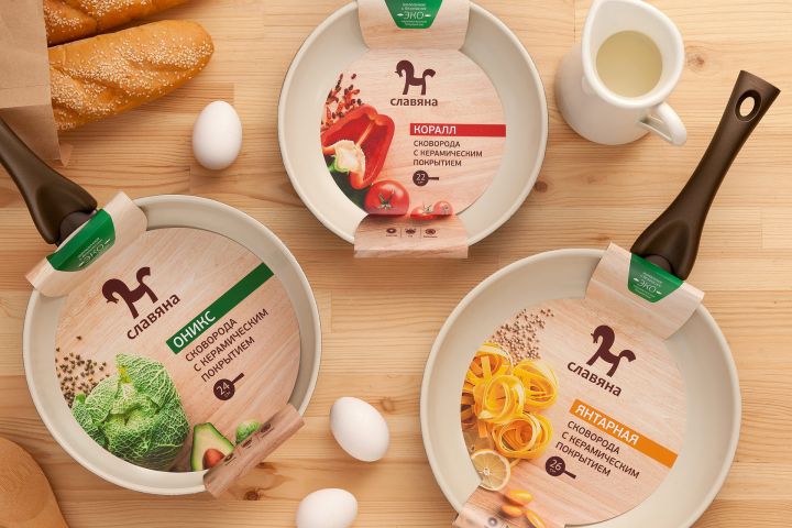 Разработать дизайн упаковки для новой торговой марки посуды для готовки с керамическим покрытием, низкоценового сегмента. Подчеркнуть основные характеристики марки: российское происхождение, традиционность, технологичность, экологичность и семейные ценности.